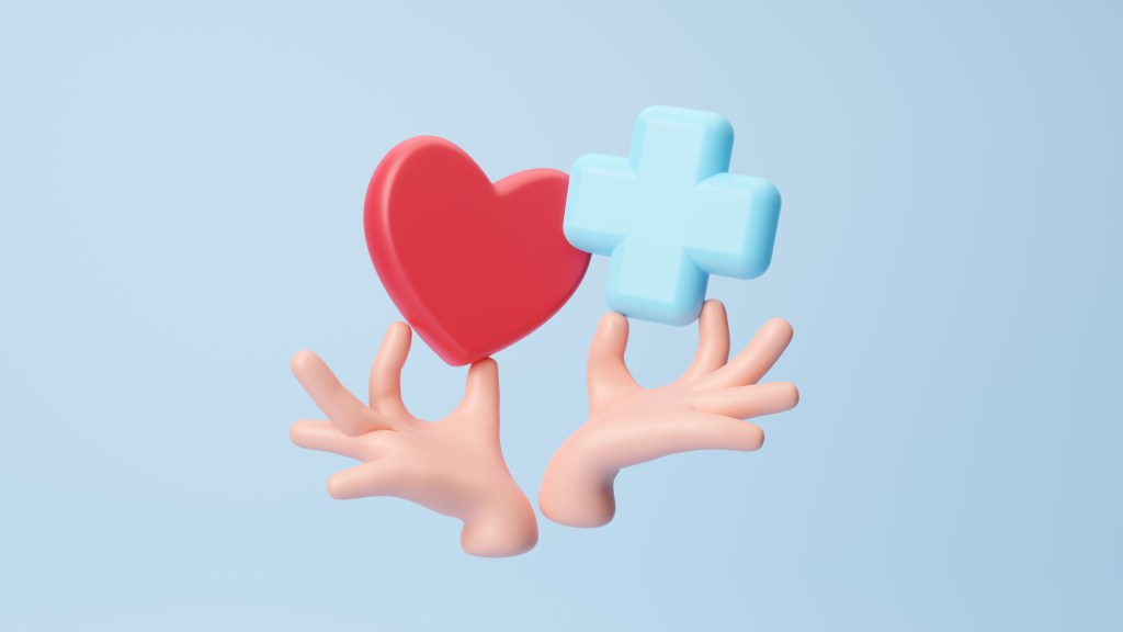 3d plus sign with red heart icon, health care love organ giving love. health care, hope, life insurance concept, world heart day, world health day. Health welfare. Relationships in love. 3d rendering
