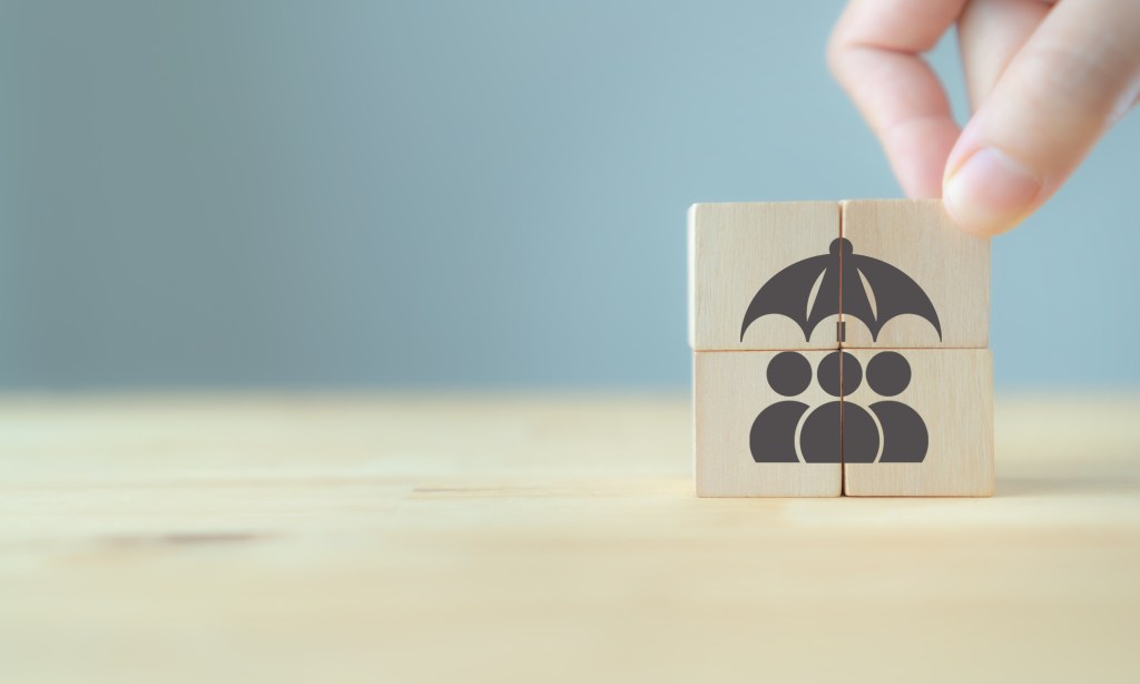 Protection people health and life group insurance concept. Care for employees. Hand puts the wooden cubes with the umbrella protect the group of people on beautiful grey background with copy space.