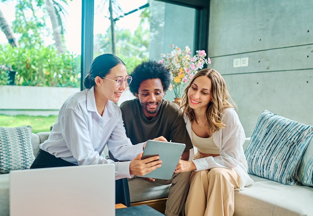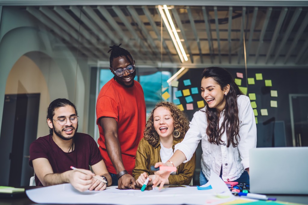 Young creative dedicated startup team preparing for presentation of business project and discussing ideas while working together at table with paper draft